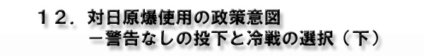 「日本への原爆使用」の政策意図は、その表層に「ソ連を核兵器開発狂奔への道」に追いやる、という目的が先ずあったことになる。この目的を効果的に達成するためには、出来るだけ劇的な形で、原爆をデビューさせる必要があった。その形が「警告なしの使用」ということである。