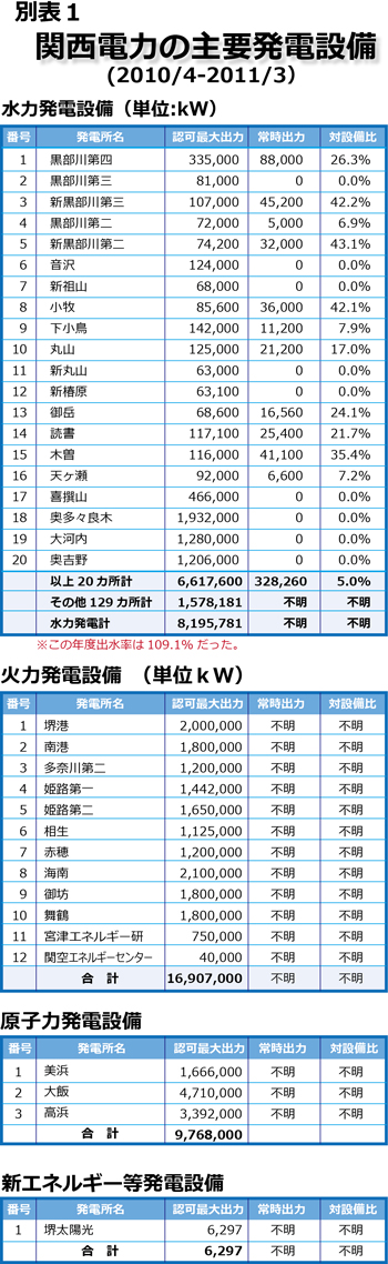 特にひどいのはコストが安いはずの水力発電である。この年度関電管内の出水率は109.1%だった。つまり特にひどい水不足の年ではなかった。というよりも関連河川の水量は過去30年間の平均に比べてほぼ1割り増しだったのである。にも関わらず、別表1を見てわかるように、関電傘下主要水力発電所20カ所の常時発電量は認可された発電設備出力に対してわずか5%だった。
