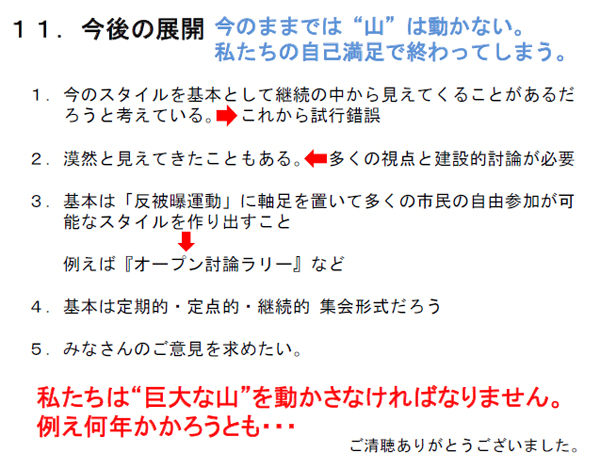 少しずつ拡大していることは間違いない。また毎週決まった時間に、その時々のトピックを調査研究して訴えるというスタイルは、デモの道筋にあたる広島本通り商店街のオーナーや従業員の方々からの一種の信頼は醸成しつつあるように思える。またチラシのハケ具合からも少しずつの拡大は確認できる。 これとは別に、やはり企業で働く勤労者・労働者、小規模経営を行う商店街のオーナー、そしてその従業員の人たちは、さすがに実社会で実績を築いているだけあって、レベルが高い。また高年齢層は人生経験も豊富であり、ものごとを見る目や評価も的確。情報収集能力や分析能力も高い。また一般的には批判能力も高い。こうした人たちを説得して行くには、私たちも相当高いレベルで幅広い情報や分析の集積が必要となる。このことを学んだ。翻って見ると現在の反原発市民運動レベルの理論水準や情報集積レベルでは、まだまだ世の中を変えていくほどの中身になっていないと感じさせられる。「原発や放射能のことは一般市民は何も知らない。教えてやろう」程度の認識で、一般市民社会の中に打って出ようとすると手痛いしっぺ返しを食うだろう。私たち反原発・反被曝運動側の一層の研究と理論武装が必要だろう。現状のままでは、政治・経済・社会の激しい動きやどんどん進行する危機に対応することは全く不可能になっていく。それではますますスローガンだけを連呼するだけの市民運動となり、社会全体での存在価値を失っていくかも知れない。それは日本の社会全体にとっても不幸なことだ。私たちの一層の努力が必要だ。そして一般市民の私たちに対する潜在化している期待に応えて行かなくてはならない。(スライド11) <スライド11> ![]() 少しづつの拡大とはいえ、私たちの当初の意気込み、すなわち「原発の危険性」や「低線量放射線被曝の危険性」について多くの広島市民と「認識」を共有し、また危機意識の共有化を図って、政治・政策の変更を迫る、という当初の目的から見ると、まだまだ道は遠いといわざるをえない。今のままでは私たちの「自己満足」に終わりかねない。 また「広島2人デモ」のスタイルもこのままでは、“点”の動きでしかない。100万都市広島の中で“面”となる動きを準備する新たなスタイルとそれに対応した一定量の人材が必要となることは自明のことだ。 この点では現在全く手探り状態であり、もっと多角的な視点で、建設的な議論を積み上げていく必要がある。ただし「反原発・反被曝」というベクトルでは全員一致していなくてはならない。「反原発・反被曝」問題を、エネルギー問題と捉えたり、環境問題と捉えたりする全く別々なベクトルを向いた集団となり、混乱ばかりが多く、結局「烏合の衆」となってしまい、敵を利するばかりだ。「反原発・反被曝運動」は、まず私たちの「生存権運動」でなくてはならない。(スライド12) <スライド12> ![]() なおレジュメには、これまで「広島2人デモ」で使用したプラカードのいくつかを例示として添付した。 ![]() |
